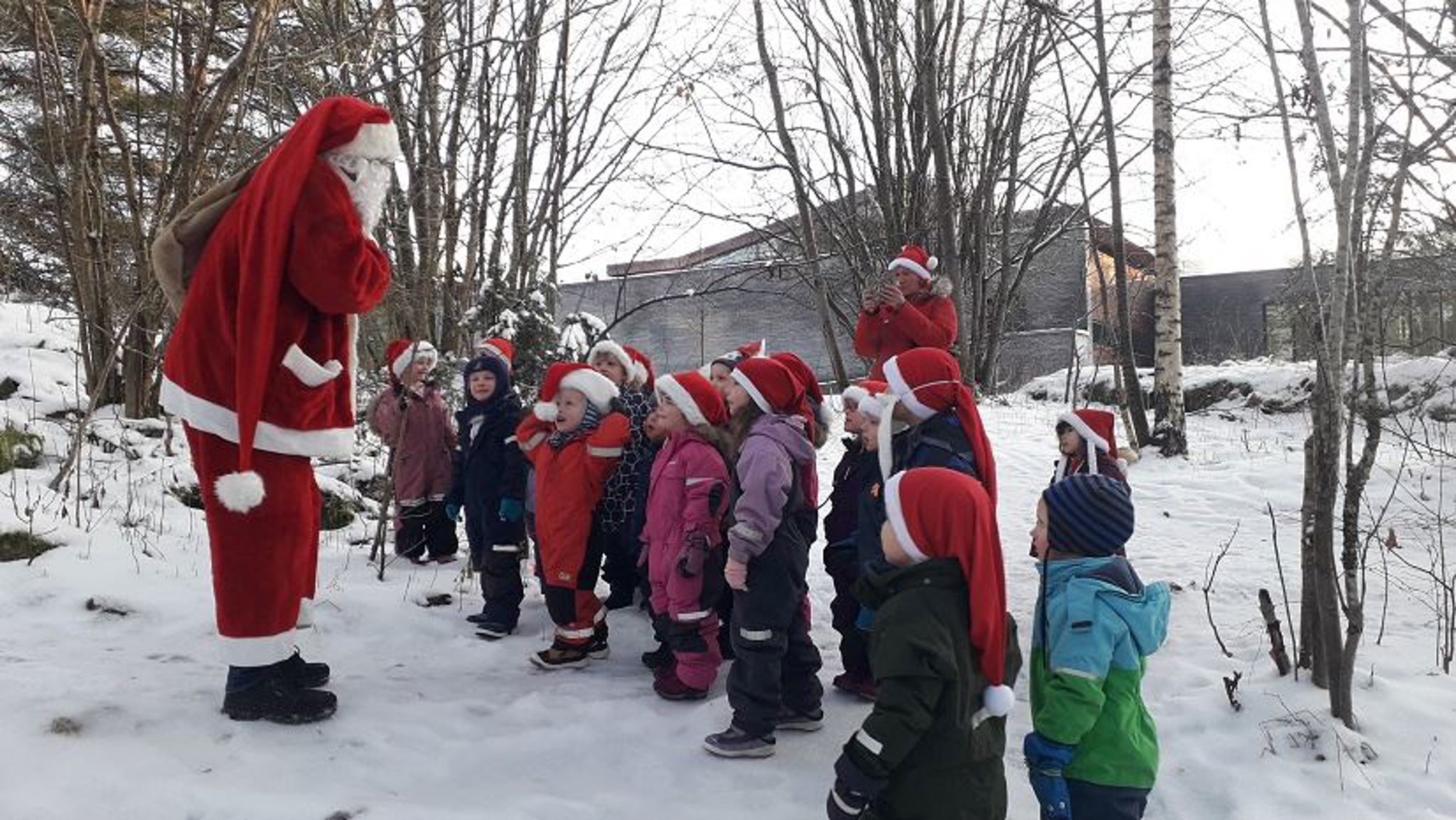 På tur i Kirkeskogen fant vi Nissefar! Alle nissungene gikk i skogen og ropte. Og der kom han jammen gående med sekk på ryggen, langt skjegg og fine, røde klær. Selv om det enda var mange dager igjen til jul, var Nissefar på farten, hilste på alle barna og ble til også med til barnehagen og møtte de aller minste nisseungene. Det var alt for glatt i skogen til at de kunne være med på nissejakten. Men han hadde husket på dem også, så alle fikk pose av nissen.
