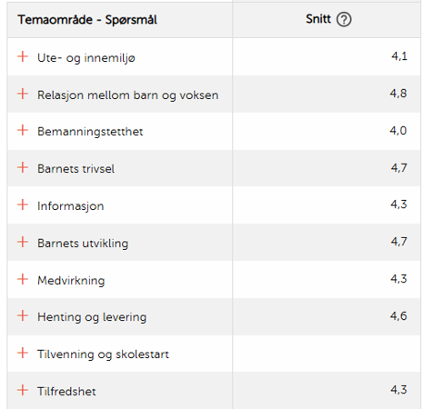Vi er spesielt fornøyde med de høye resultatene på relasjonen mellom barn og voksen, barnets trivsel og barnets utvikling. Dette er områder som er helt sentrale for barnas hverdag i barnehagen, og som vi arbeider mye med.